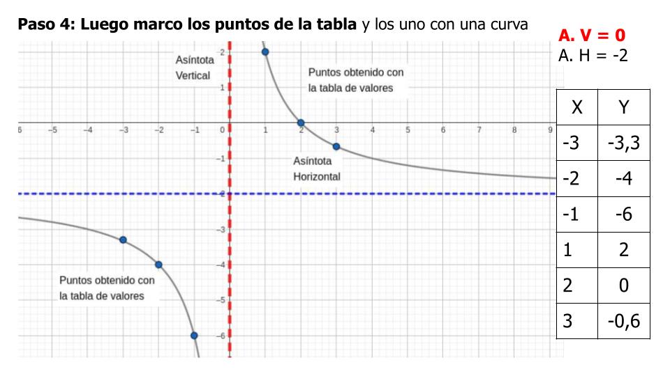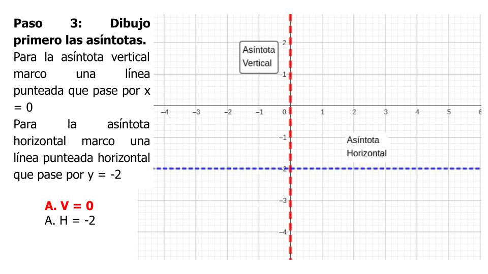 Para dibujarlas necesitamos identificar las dos asíntotas y realizar una tabla de valores. Para la tabla debemos elegir tres números a izquierda de la asíntota vertical y tres números a derecha.